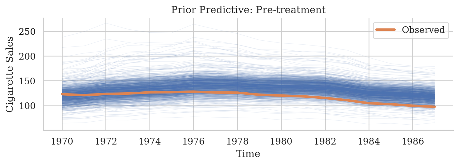 Now that we have the posterior distribution of the model parameters, we can estimate the causal effect of Proposition 99. We do this by generating a counterfactual outcome for California in the post-treatment period. This is the outcome that would have been observed had the intervention not occurred. The counterfactual is generated by taking the posterior predictive distribution for the post-treatment period.