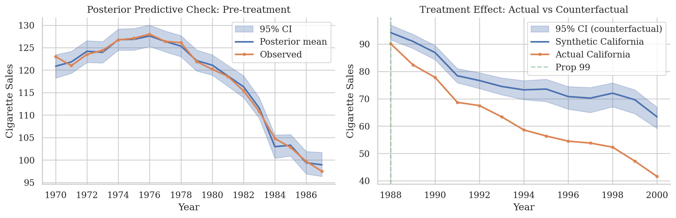 After fitting the model on the pre-treatment data, we perform a posterior predictive check. This involves generating data from the model using parameter values from the posterior distribution. The left-hand panel below shows that the fitted model provides a good description of the pre-treatment data. The right-hand panel shows the model’s counterfactual prediction for the post-treatment period, which is what we will use to estimate the treatment effect.