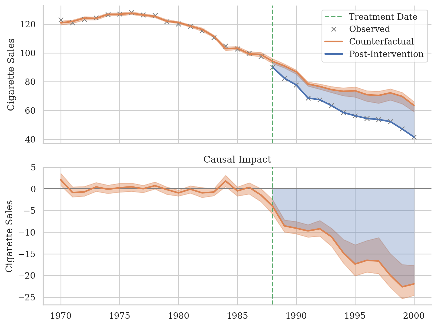 The treatment effect is the difference between the observed outcome and the counterfactual outcome. A negative effect suggests that Proposition 99 led to a decrease in cigarette sales.