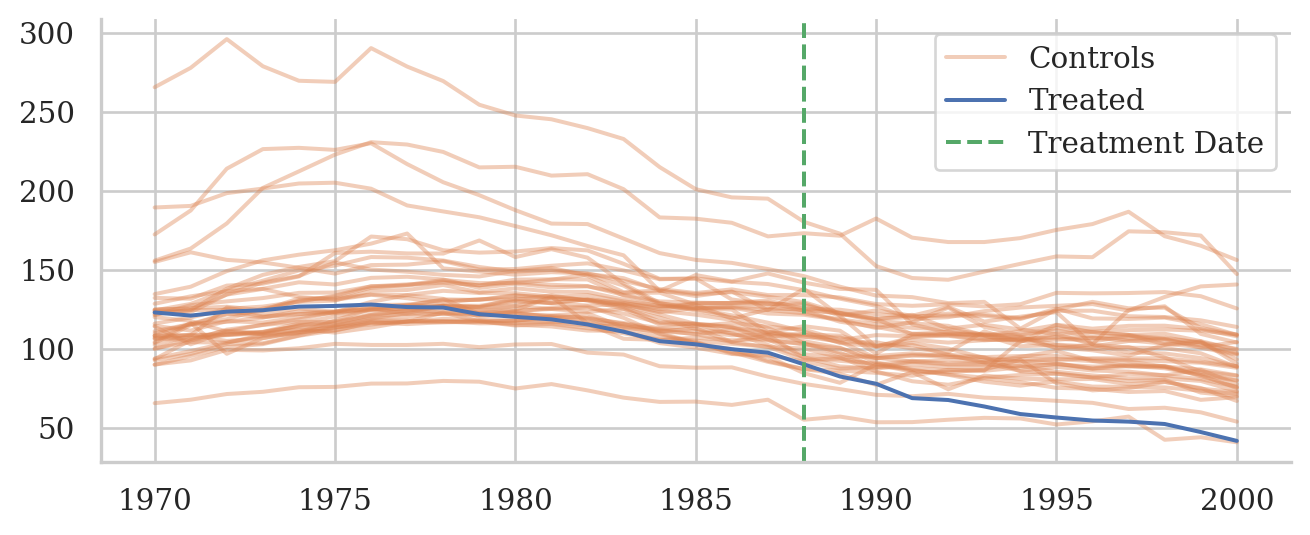 We use the california_smoking.csv dataset, which contains per-capita cigarette sales for 39 US states from 1970 to 2000. The treated unit is California, where Proposition 99 was passed in 1988 to increase cigarette taxes.